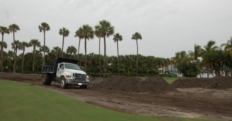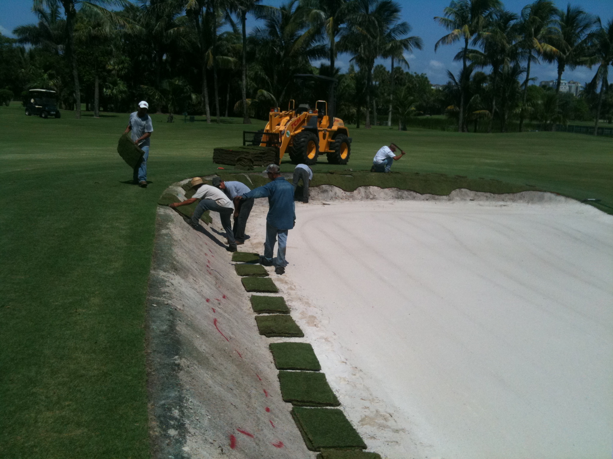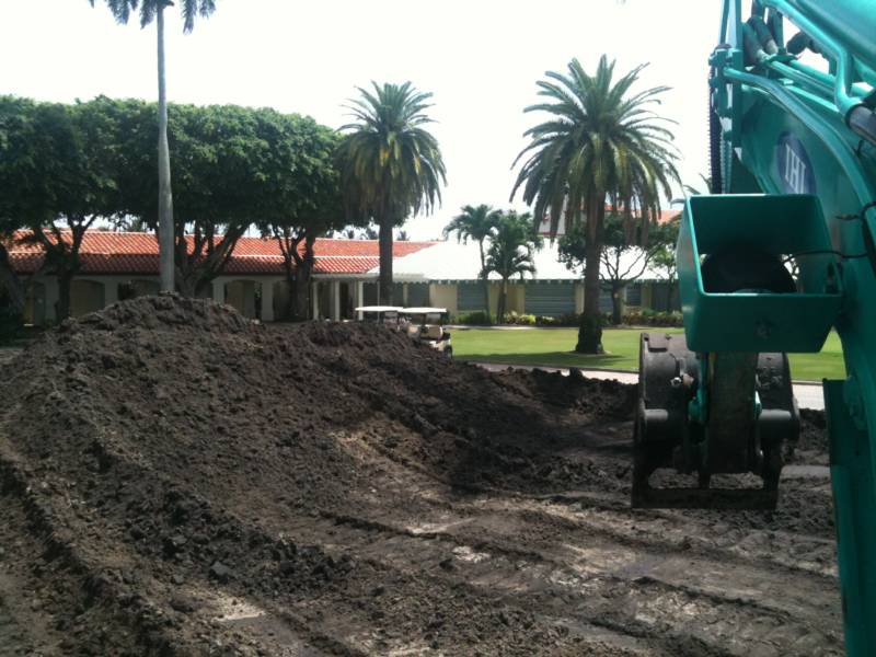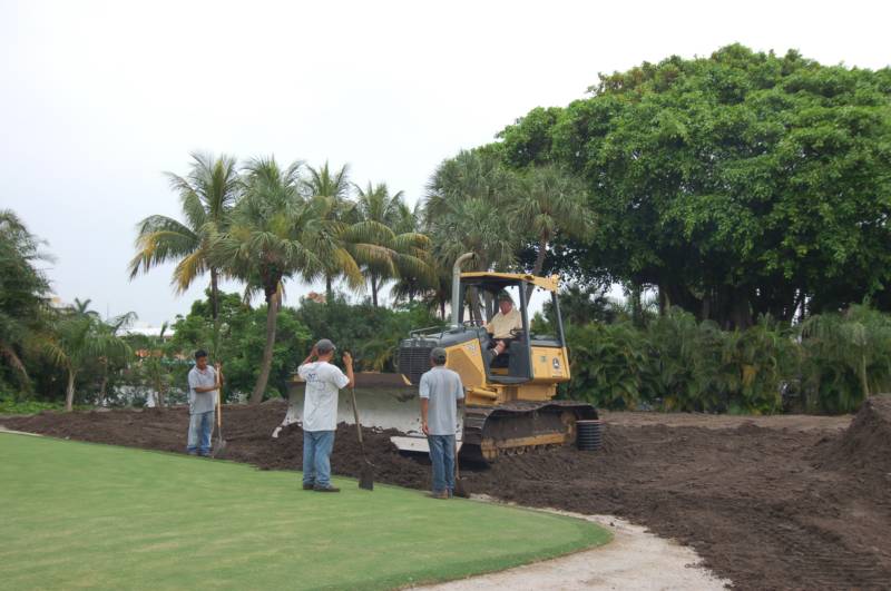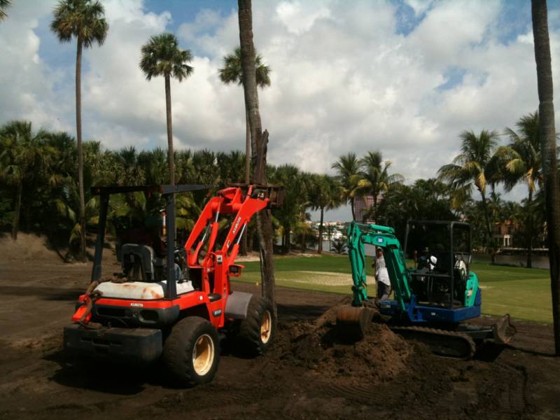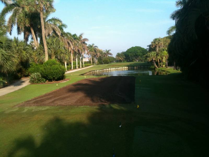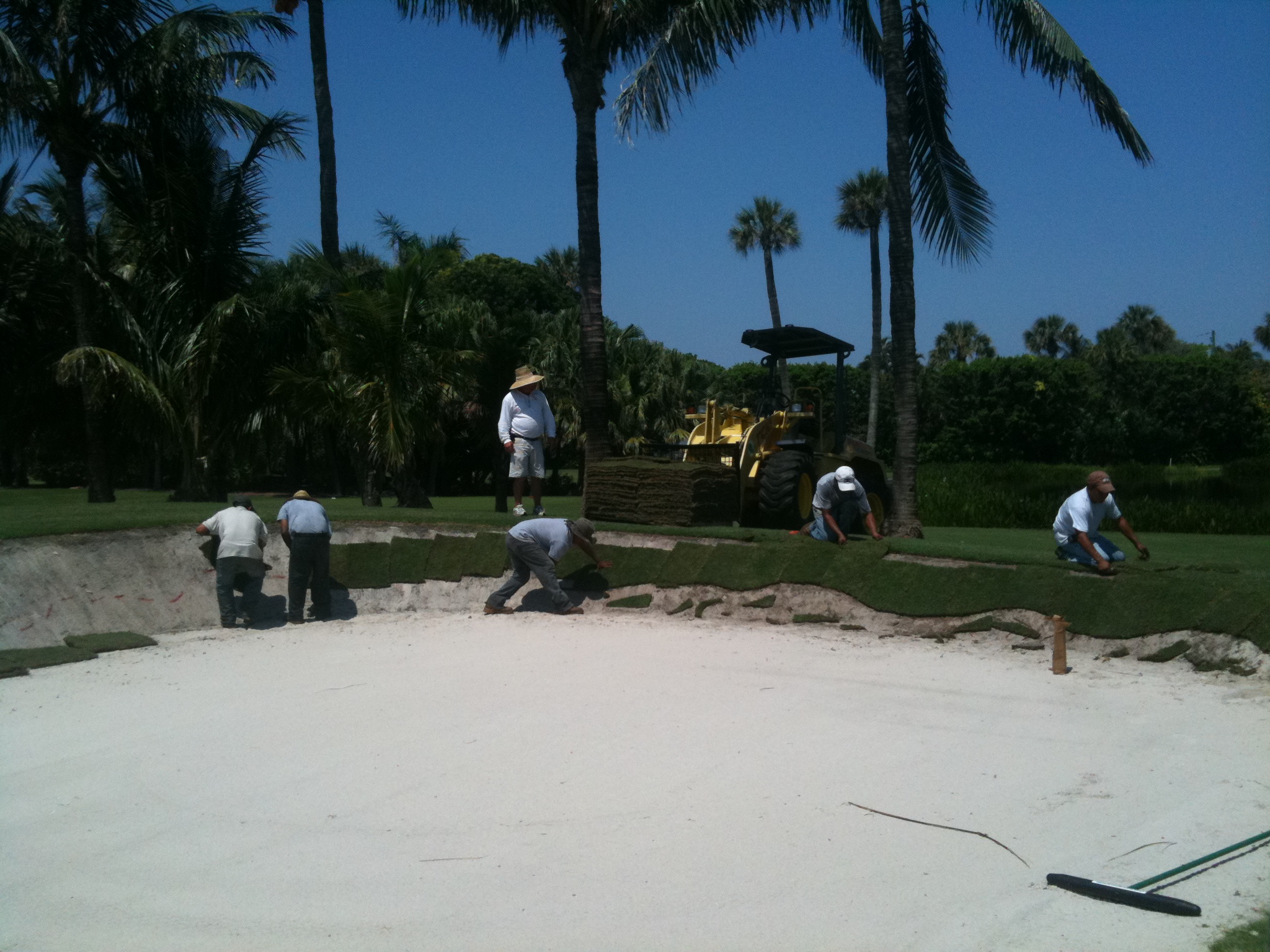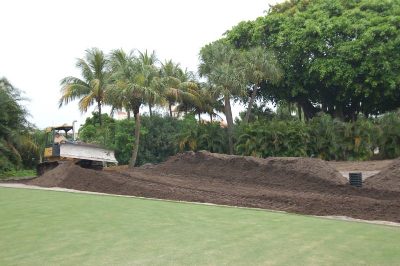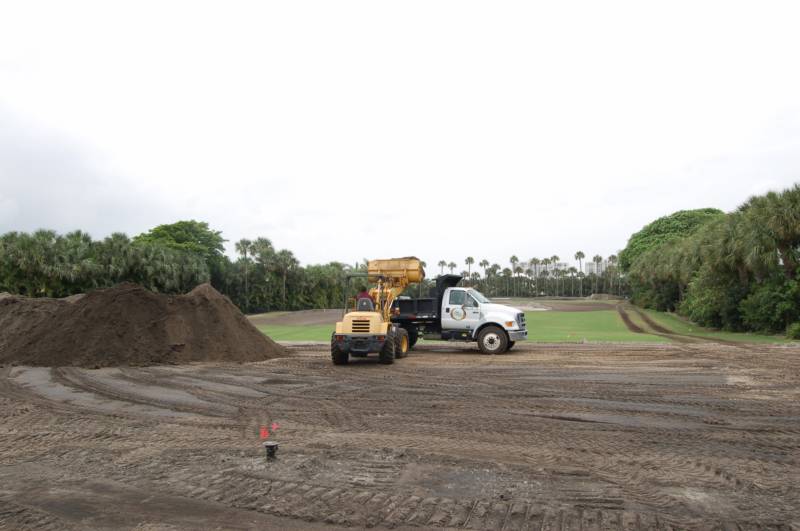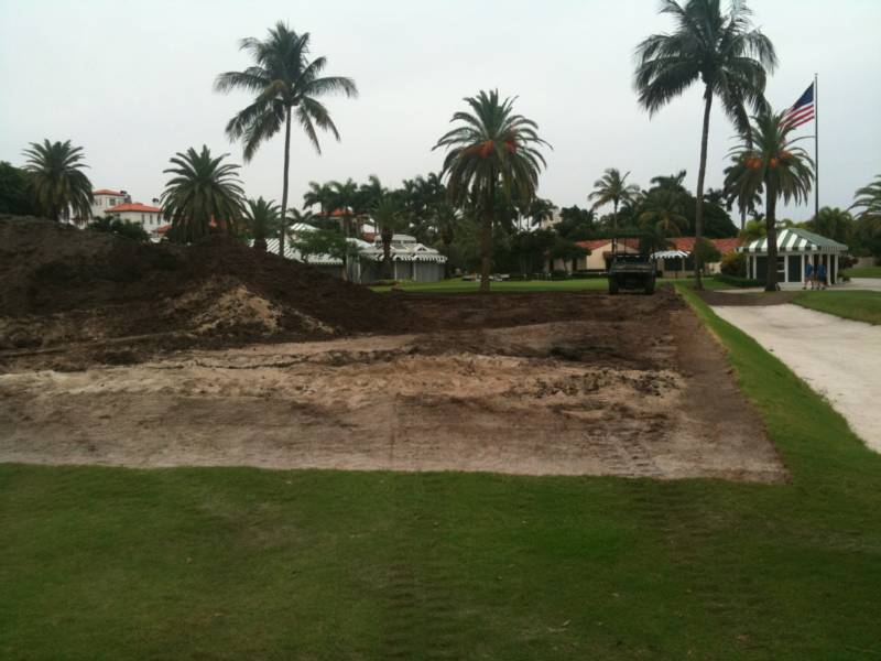 Everglades Club in Palm Beach, Florida. Along with the renovation's of the Driving Range Tee, which was lowered 5'. Utilizing the soil to create a 500' burm, new irrigation and re-locating of 300+ Palm Tree's. We also Strip, Laser Level and enlarge the Tee's surface then re-shape the Bunkers. The Driving Range and the Tee's will be SeaIsle I Paspalum and the Bunkers, Tifgrade Bermuda Turf.