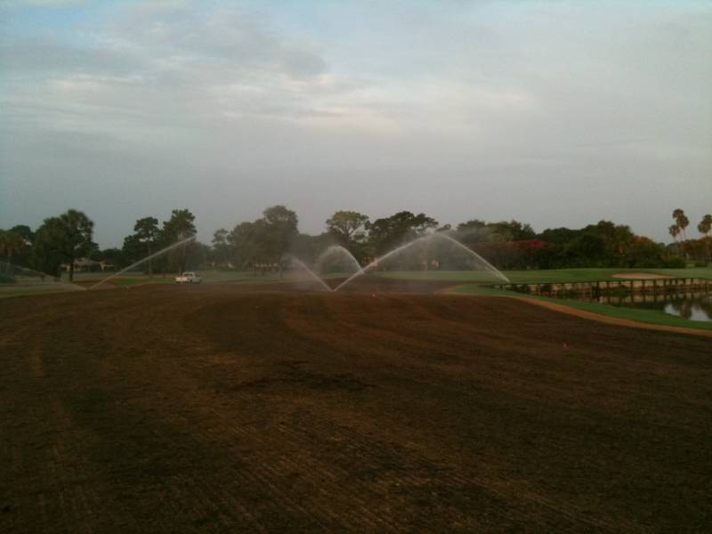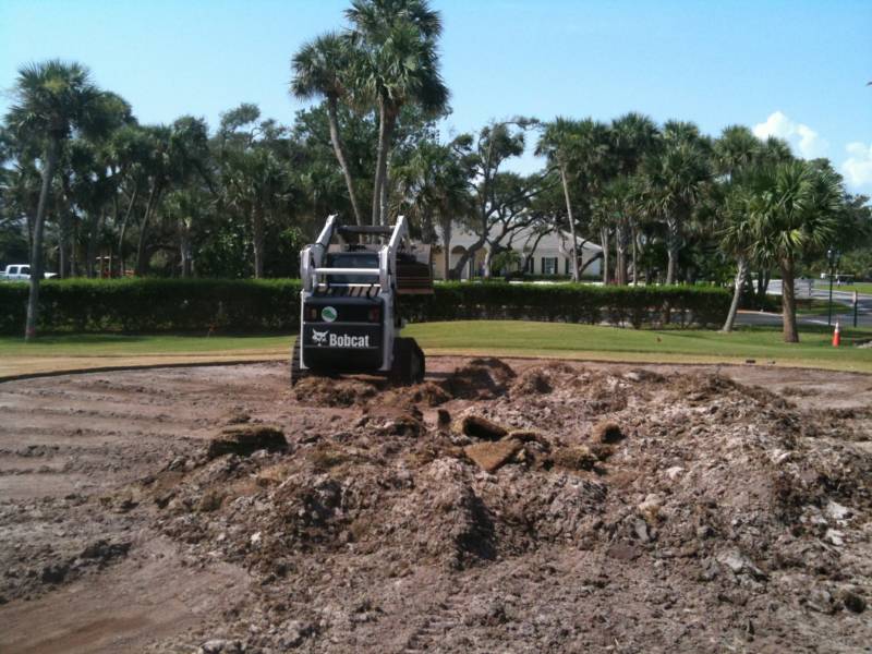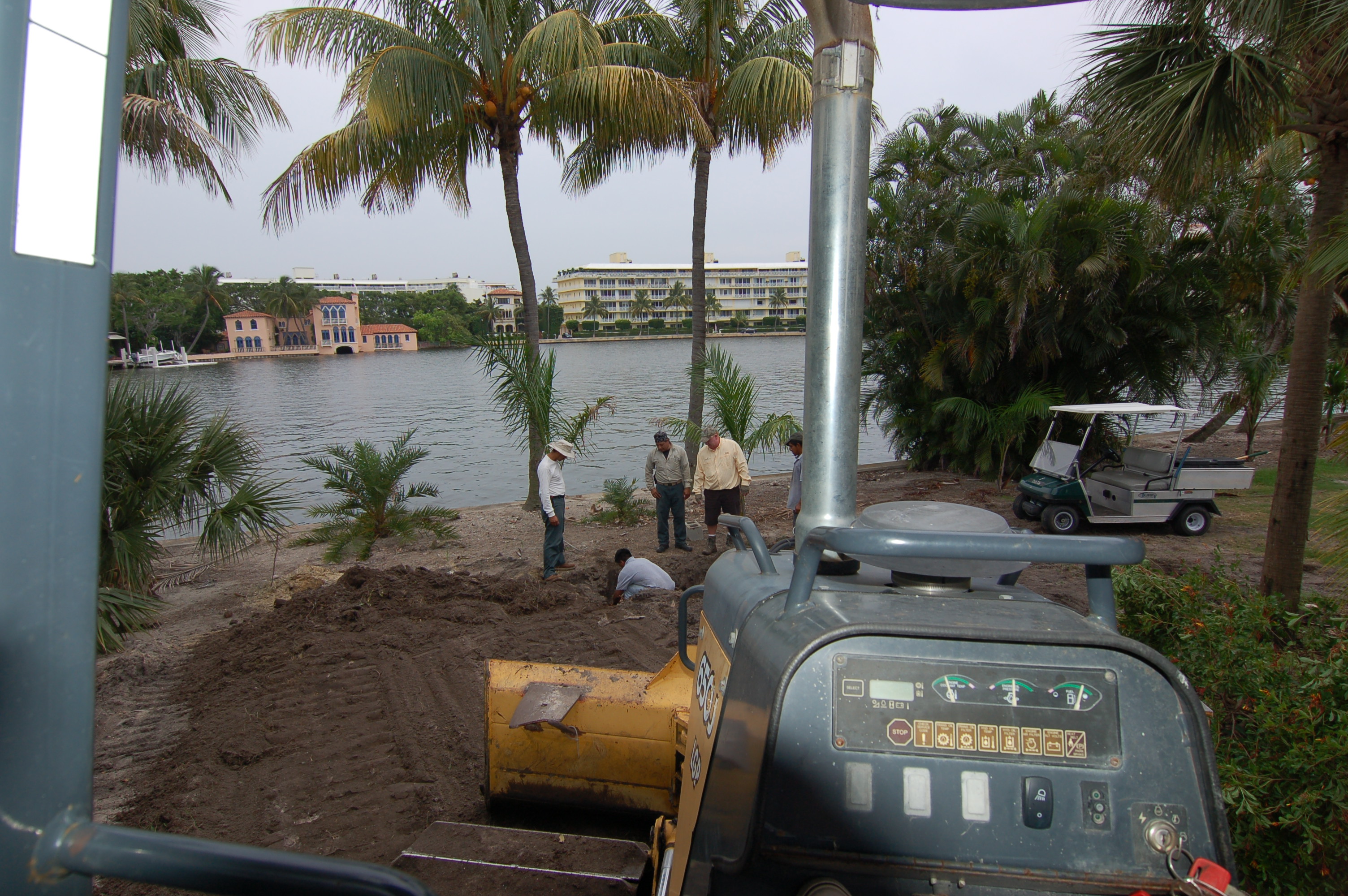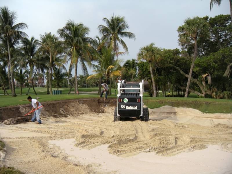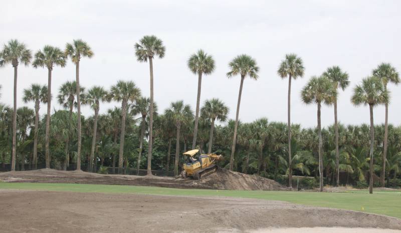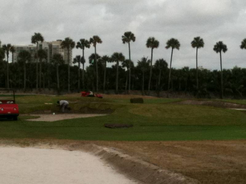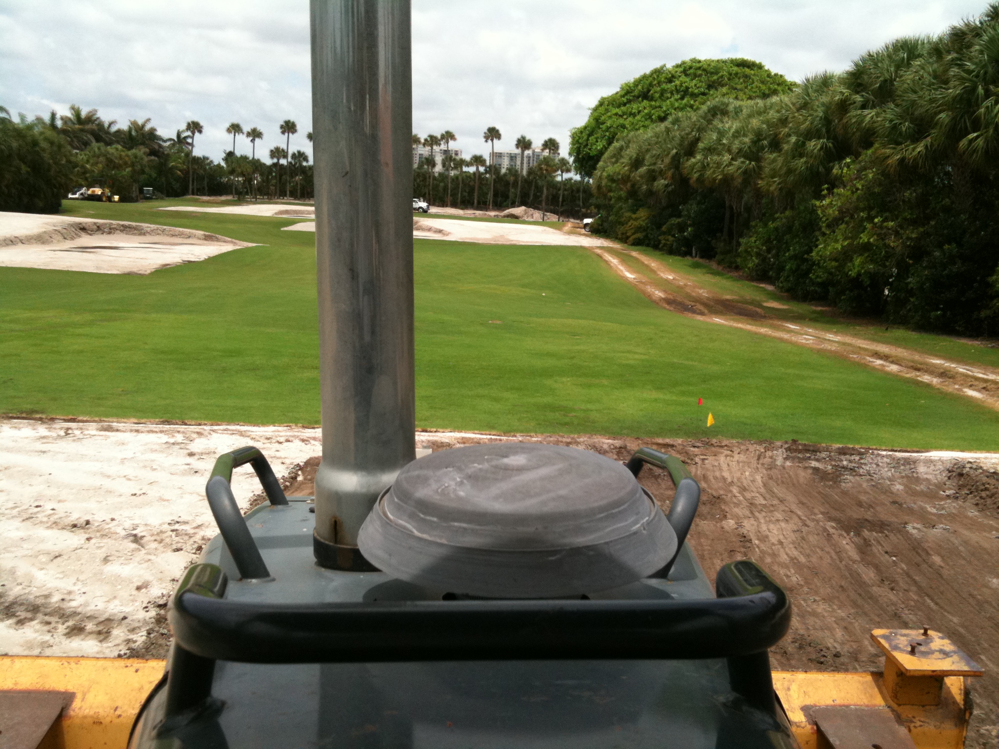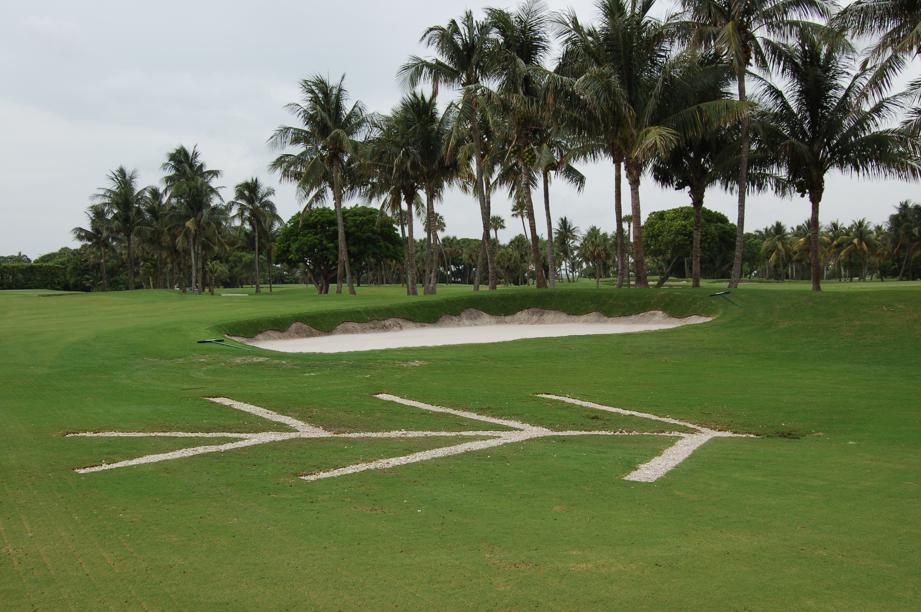 Everglades Club in Palm Beach, Florida. Along with the renovation's of the Driving Range Tee, which was lowered 5'. Utilizing the soil to create a 500' burm, new irrigation and re-locating of 300+ Palm Tree's. We also Strip, Laser Level and enlarge the Tee's surface then re-shape the Bunkers. The Driving Range and the Tee's will be SeaIsle I Paspalum and the Bunkers, Tifgrade Bermuda Turf.