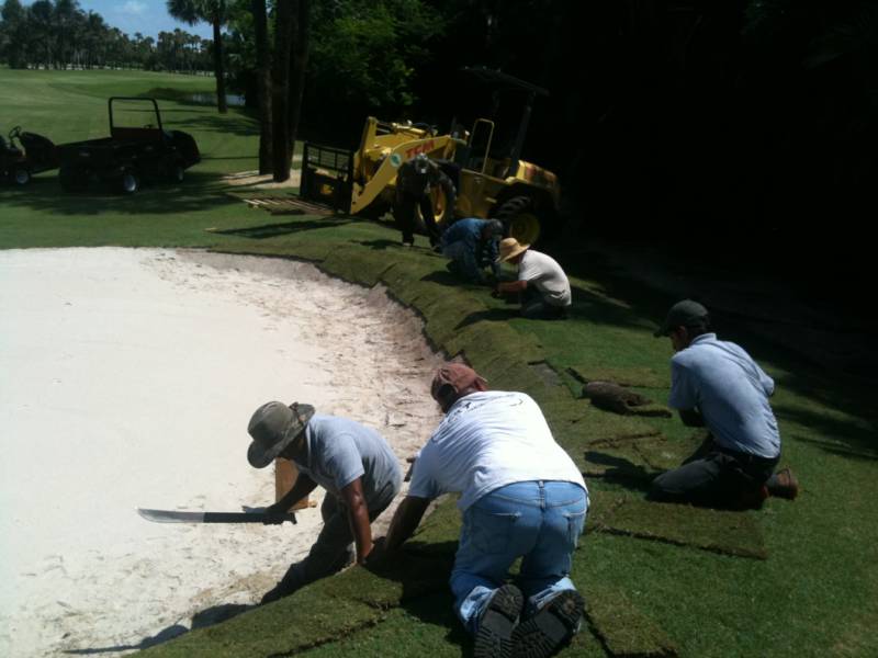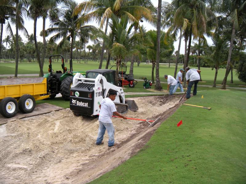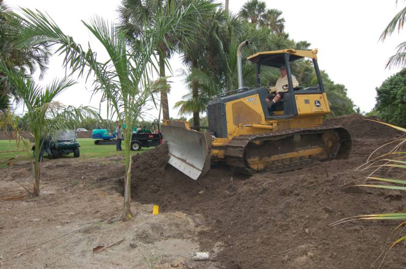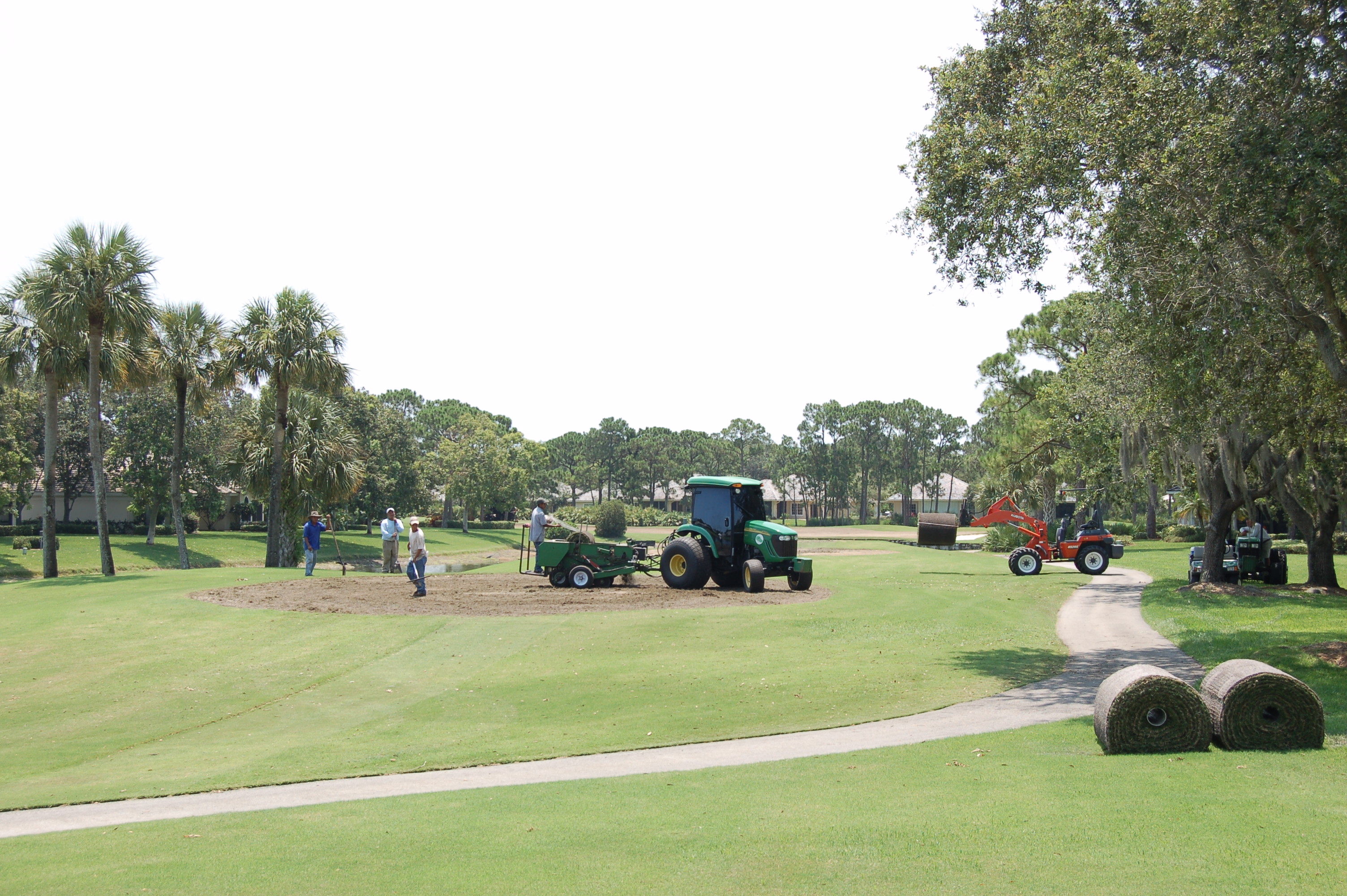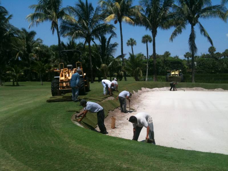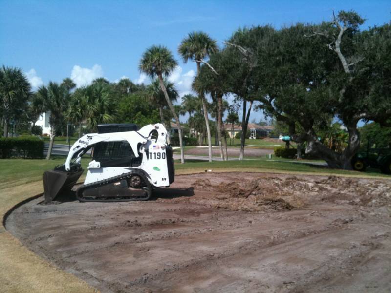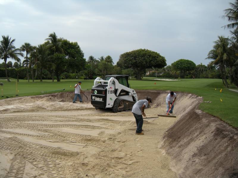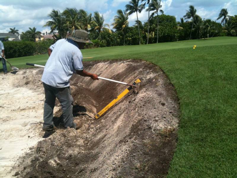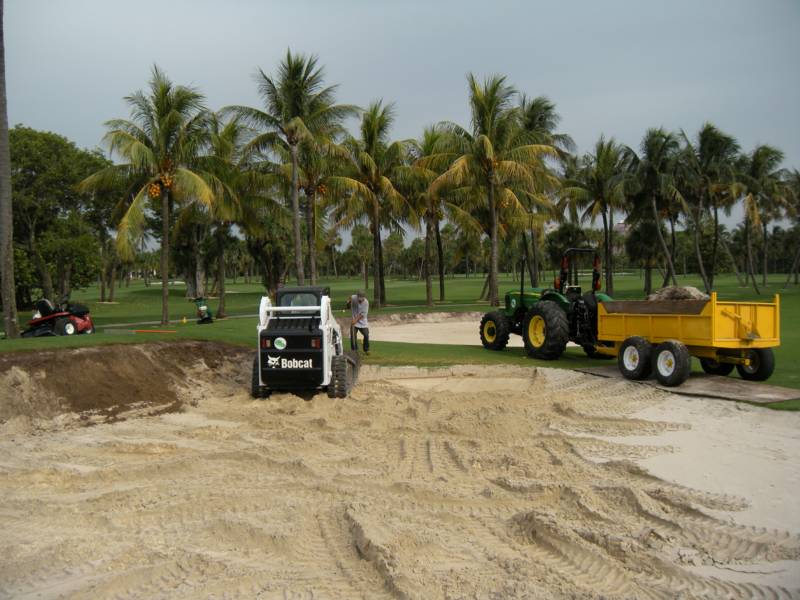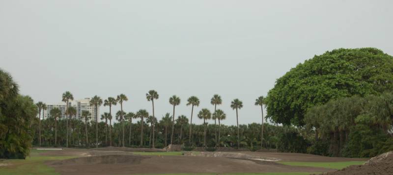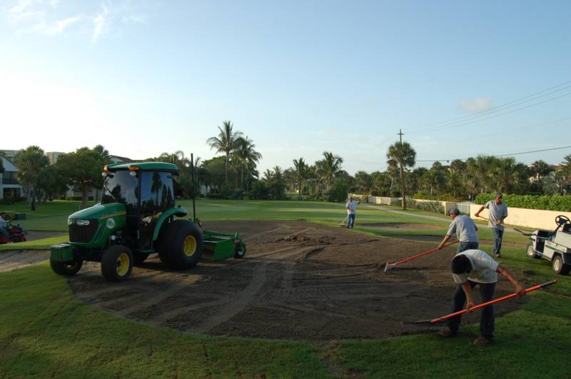 Everglades Club in Palm Beach, Florida. Along with the renovation's of the Driving Range Tee, which was lowered 5'. Utilizing the soil to create a 500' burm, new irrigation and re-locating of 300+ Palm Tree's. We also Strip, Laser Level and enlarge the Tee's surface then re-shape the Bunkers. The Driving Range and the Tee's will be SeaIsle I Paspalum and the Bunkers, Tifgrade Bermuda Turf.