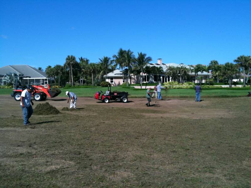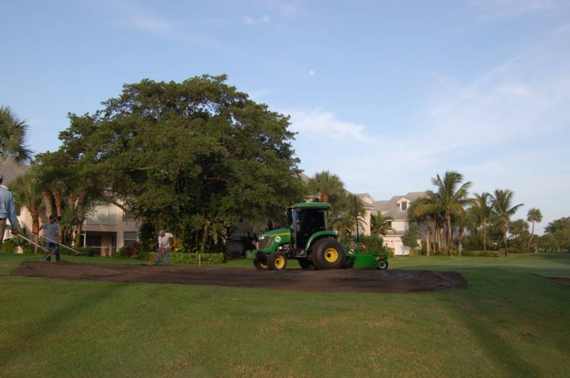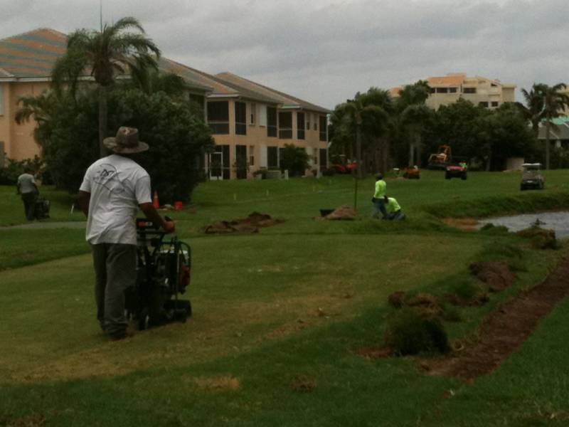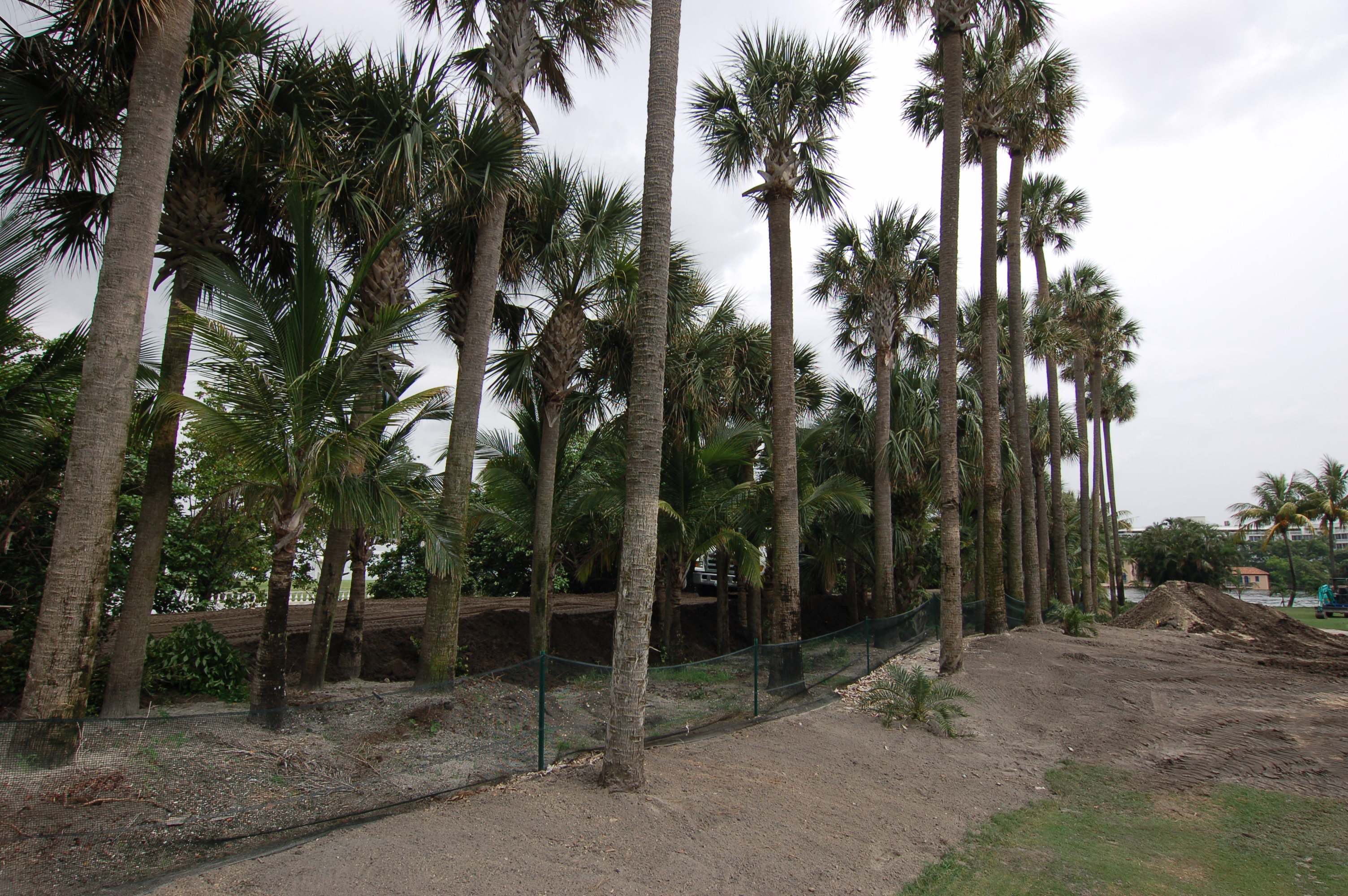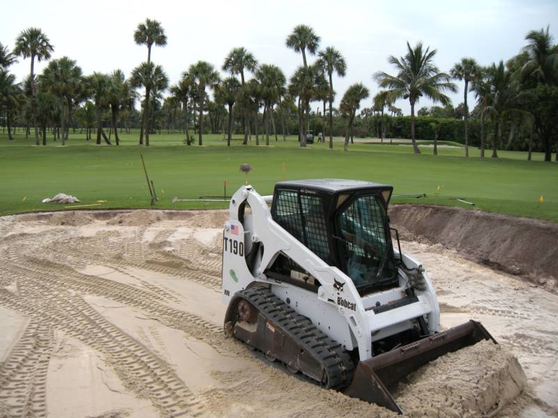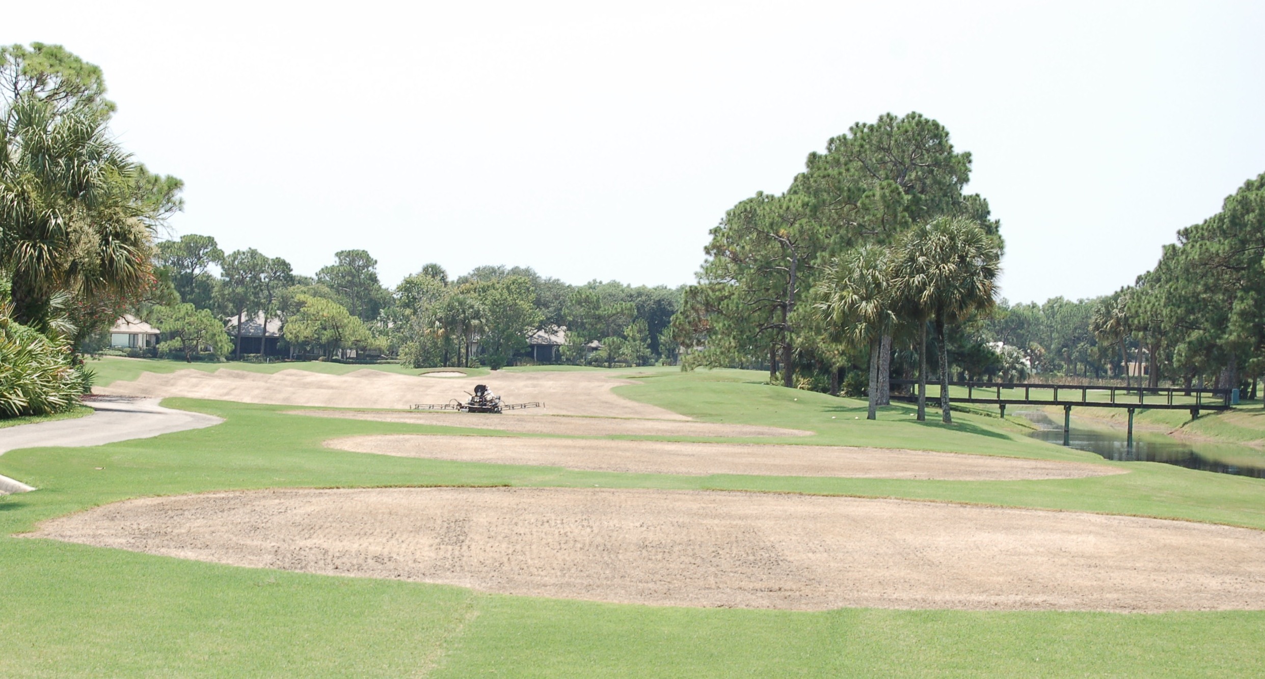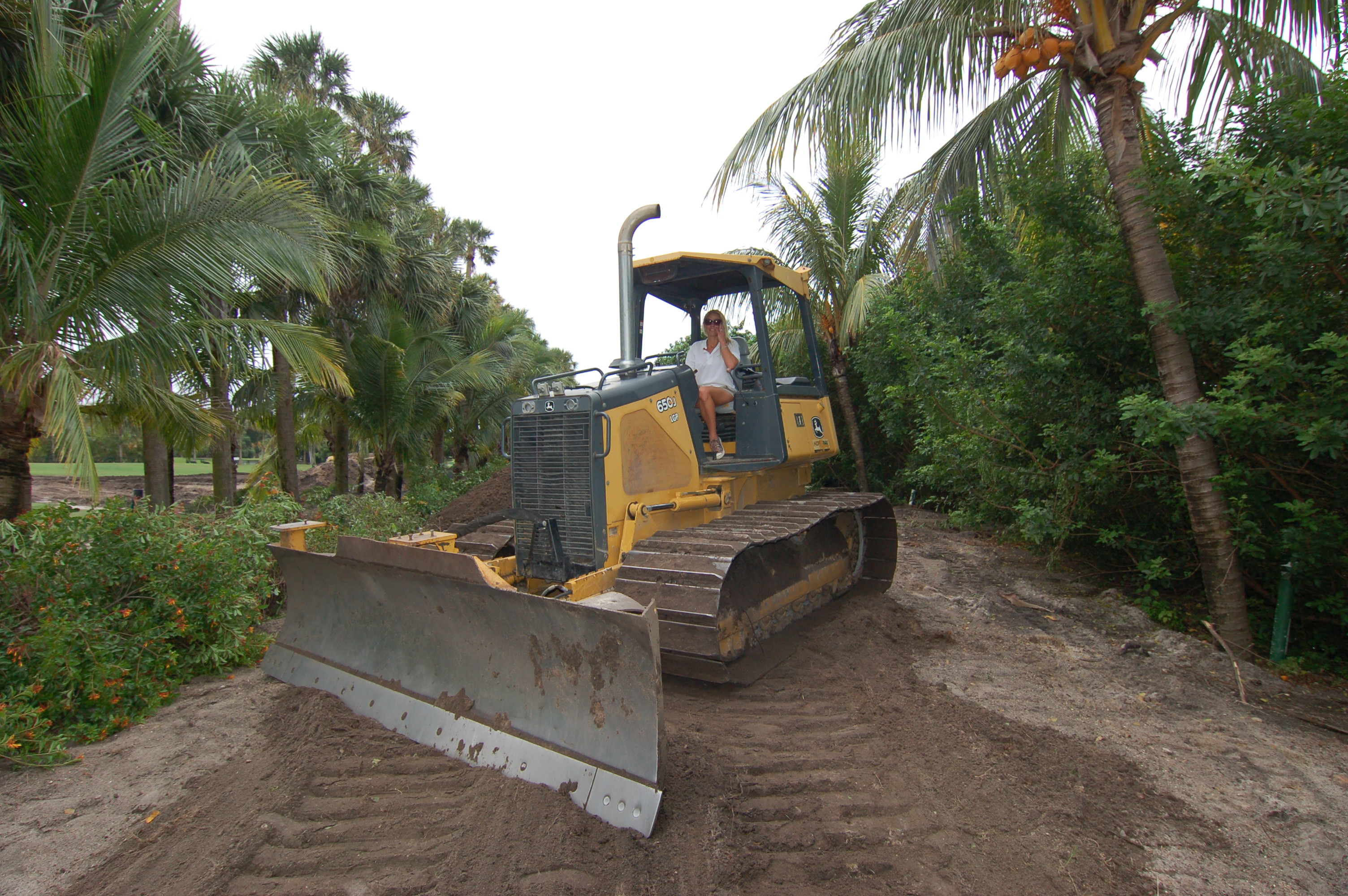 Everglades Club in Palm Beach, Florida. Along with the renovation's of the Driving Range Tee, which was lowered 5'. Utilizing the soil to create a 500' burm, new irrigation and re-locating of 300+ Palm Tree's. We also Strip, Laser Level and enlarge the Tee's surface then re-shape the Bunkers. The Driving Range and the Tee's will be SeaIsle I Paspalum and the Bunkers, Tifgrade Bermuda Turf.