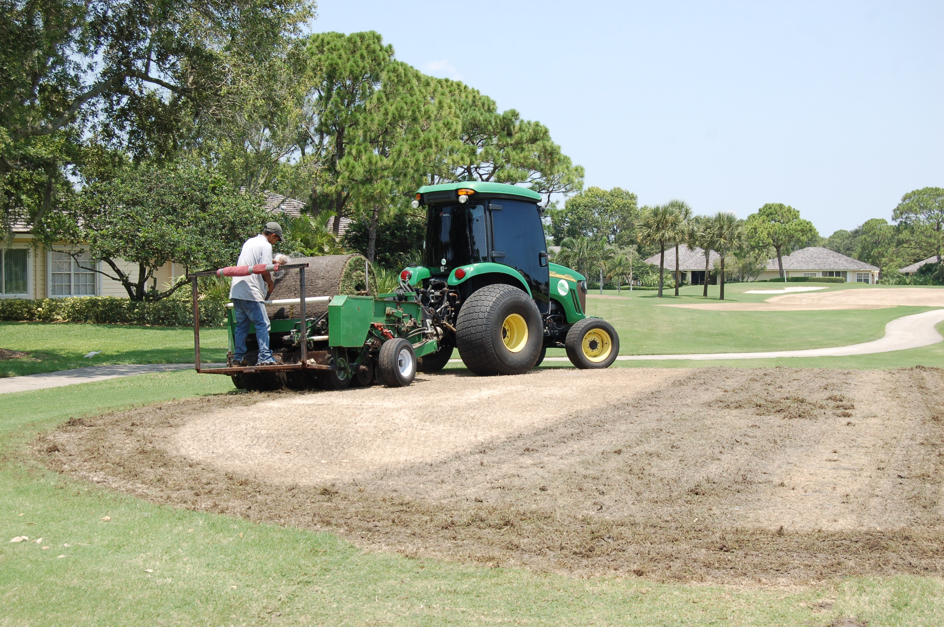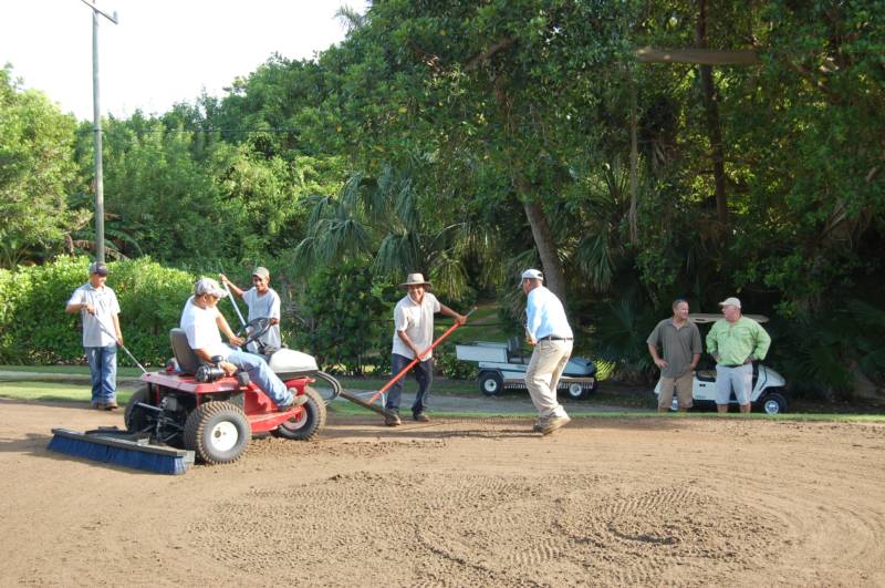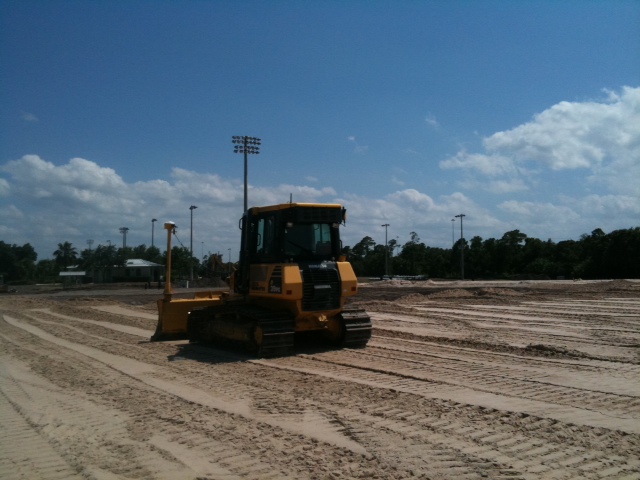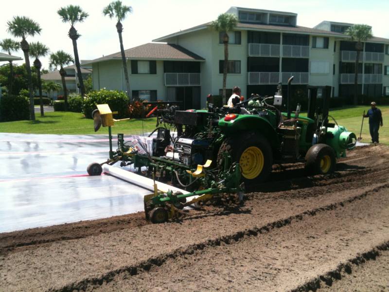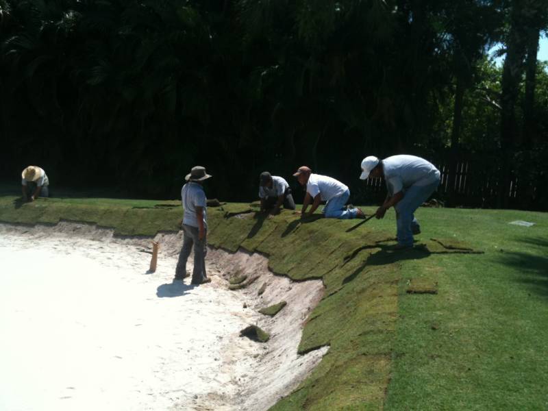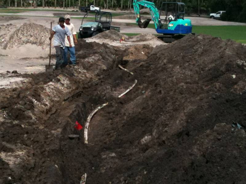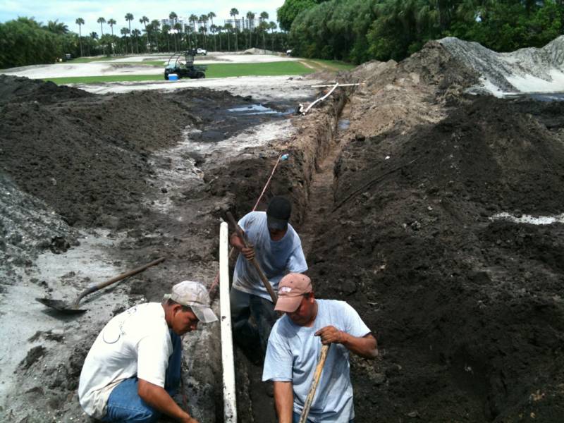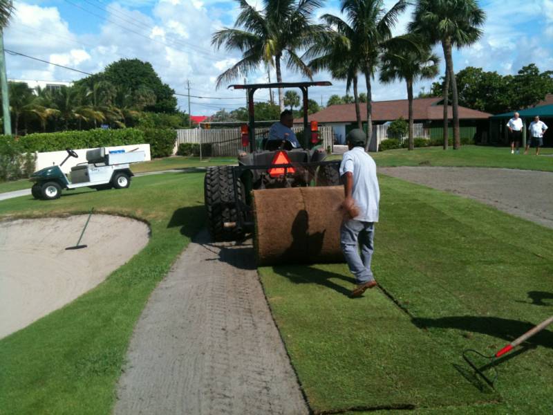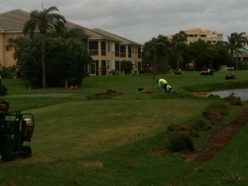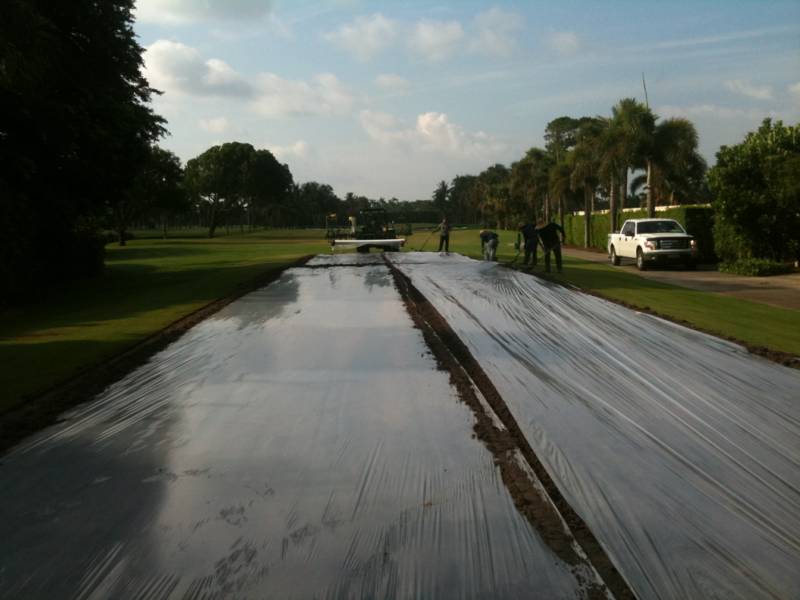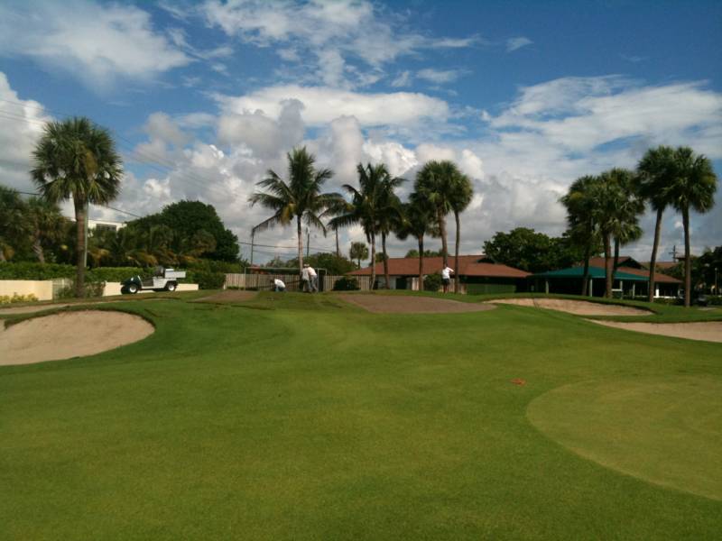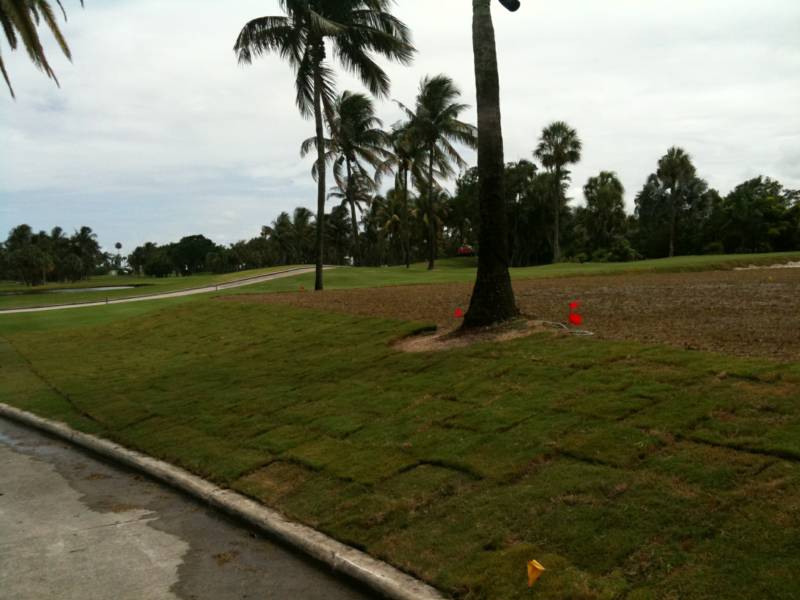 Everglades Club in Palm Beach, Florida. Along with the renovation's of the Driving Range Tee, which was lowered 5'. Utilizing the soil to create a 500' burm, new irrigation and re-locating of 300+ Palm Tree's. We also Strip, Laser Level and enlarge the Tee's surface then re-shape the Bunkers. The Driving Range and the Tee's will be SeaIsle I Paspalum and the Bunkers, Tifgrade Bermuda Turf.